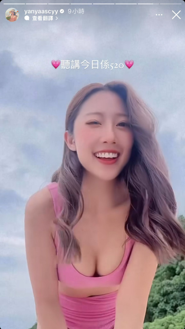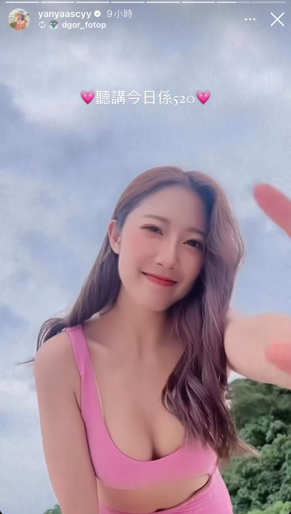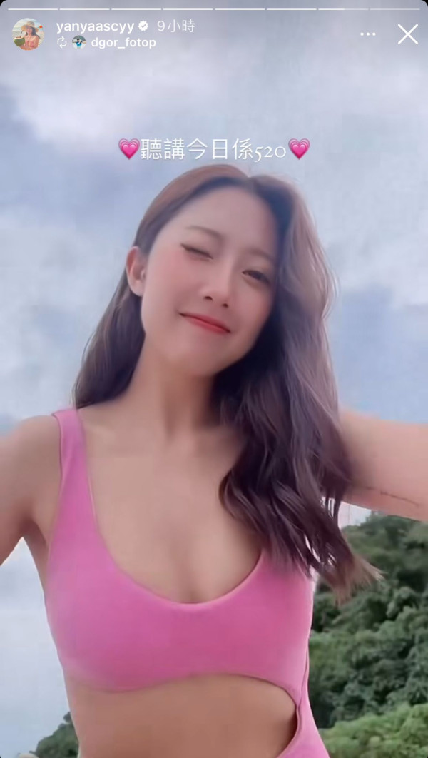 星期一(5月20日)是網絡的520情人節,陳欣茵沒有與另一半慶祝反而在社交網大派福利照。她在限時動態分享了一段身穿粉紅色低胸泳衣的影片,配文「聽講今日係520」,隨即拍攝者就在旁邊表示「我發現欣茵正面望唔夠靚,有個新角度超靚」,鏡頭瞬間由正面拍攝變「低炒」,欣茵就俯身向著鏡頭擺動不同的姿勢,上圍變得超洶湧,超吸睛!