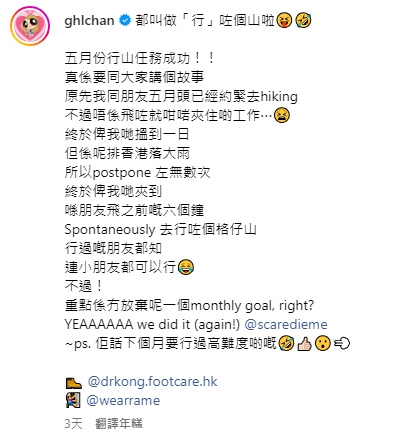 近年迷上行山做運動的Grace,最近又相約朋友去行山,她撰文表示「五月行山任務成功!!原先我同朋友五月頭已經約緊去hiking,不過唔係飛咗就咁夾住啲工作⋯😫終於俾我哋搵到一日,但係呢排香港落大雨,所以postpone 左無數次。終於俾我哋夾到喺朋友飛之前嘅六個鐘Spontaneously 去行咗個格仔山,行過嘅朋友都知連小朋友都可以行😂」。