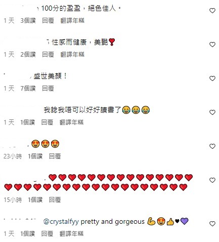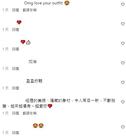 這次性感的打扮吸引大批網民在文中大讚「FYY 脫胎換骨💯💯💯 名副其實嘅美貌與智慧並重🔥🔥🤘🏻」、「兩個字: 完美」、「超級勁索💯」、「盈盈狀態依然咁索❤️」、「Fyy好漂亮😍😍好迷人魅力🔥」、「隱藏的身材,令人耳目一新,不斷脫變,越來越優秀~超愛妳❤️」。