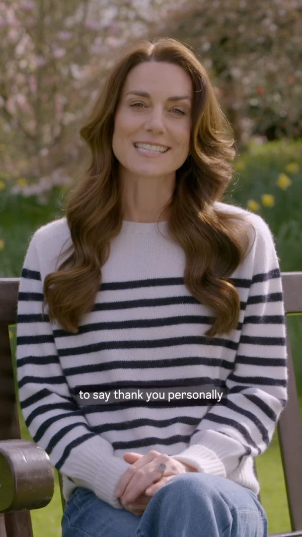 凱特王妃亦有對丈夫表示感謝:「威廉一直在我身邊,給我極大的安慰和信心。同樣,許多人對我們表達的愛、支持和善意也給予了我們很多鼓勵。對我們來說,這意義非凡。」她還指對他們整個家庭來說,過去幾個月非常艱難,但她擁有一個出色的醫療團隊,非常細心地照顧著自己, 她對此感激不盡。最後她亦鼓勵其他患病人士:「不要失去信心或希望,你並不孤單。」