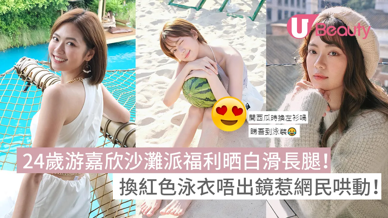 數張沙灘靚相中,有一條嘉欣徒手開西瓜的短片,不過眼利的網民就發現當時嘉欣身穿紅色的泳衣,露出大長腿。隨即網民就在文中表示「可唔可以影番件紅色泳衣😂」、「開西瓜時換左衫喎,有無福利先😂」、「第3張就biniki 頭2張就著到咁密實🙄」、「冇比堅尼?😍」。