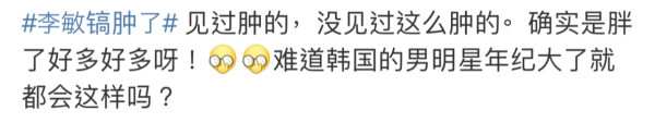 李敏鎬身穿白色西裝,身型卻暴脹不少,而且,網民紛紛把焦點放在他的「腫面」上,可見連本來英俊的臉蛋亦暴脹不少,不知是否水腫原故,李敏鎬的雙下巴尤其嚴重,甚至「腫」到失去頸部,網民直言不忍直視:「下巴同條頸連埋一齊」,又指完全認不出昔日的男神!