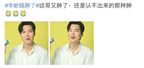 主演《花樣少年》、《繼承者們》、《Pachinko》等熱播劇的李敏鎬一直代言廣告不斷,他為護膚品牌拍攝的廣告短片釋出後即惹熱議,片中可以看到李敏鎬的臉型圓潤,甚至出現明顯的雙下巴,網民都形容他「肥到無頸」,「李敏鎬腫了」更曾衝上微博熱搜第一名!