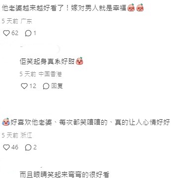 網民看到影片後都忍不住大讚「老婆越來越好看!嫁對男人就是幸福」、「陳茵媺笑起來真係好甜」、「好喜歡他老婆,每次都笑嘻嘻的,真的讓人心情好好」、「簡直就甜到爆」、「很有氣質很舒服的美」、「什麼時候都這麼甜」。