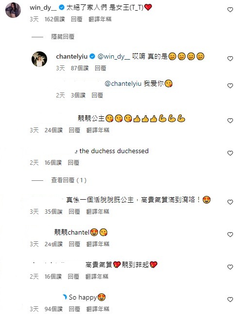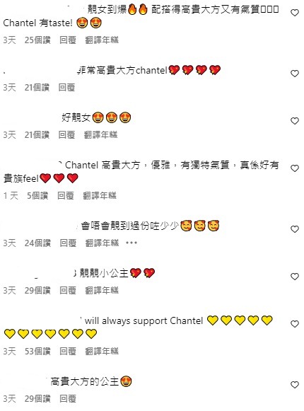 網民看到生圖後都紛紛留言表示「有氣質」、「Chantel真人真不胖」、「佢終於有得休息啦」、「好上鏡」、「覺得佢大個咗」、「好靚女啊」、「靚女菲好貼地🤩」、「太完美了!!」。