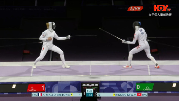 - 決賽:江旻憓決賽對手是東道主法國的瑪露比頓(Marie-Florence Candassamy),瑪露發揮主場優勢,進攻強勢,開賽Vivian以3-8 處於落後位置。江旻憓調整節奏與策略,第二節拉近兩方分數距離至7-9。第三節她再發揮世一技術,後來居上至10-10、11-11、12-12,一分一分咬緊。最後打入加時環節,Vivian以最終以13-12,為香港在今屆巴黎奧運奪得第一面金牌!