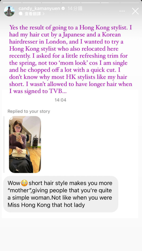 但最後修剪後的效果就驚變50+大媽,更大爆「I don't know why most HK stylists like my hair short, I wasn't allowed to have longer hair when I was signed to TVB…(我不知道為什麼大多數香港造型師都喜歡我短髮,在簽約TVB的時候都不允許我留長髮)」。向來袁嘉敏都以性感的造型示人,再次把頭髮修剪至耳下位置,風格突變,相信她都十分不習慣。早前她才在Instagram貼出數張首次在英國過新年的相片,她更特意以全紅新年裝上陣應節,相中的她穿上一條吊帶紅色閃片裙,低胸激晒成吋長事業線,相當誘人!與全新短髮造型相比,風格真的完全不一樣。