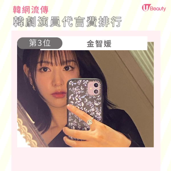 金智媛近年有不少超優質作品,包括《三流之路》、《我的出走日記》等,今年憑《淚之女王》讓事業翻倍急升。金智媛在《淚之女王》中與金秀賢CP感讓不少觀眾非常投入,加上精湛演技讓路人粉都非常深刻。而她在《淚之女王》播畢後代言接到手軟,成為新一代廣告女王,一個代言約340萬港幣!