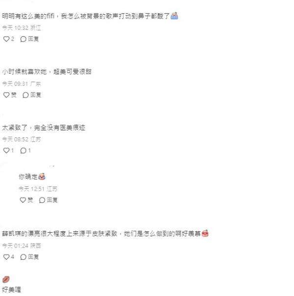 過去薛凱琪的妝容一直是不少網民的關注話題,亦曾被批「P得太重手」變蛇精,又曾被指整容過度導致面目全非!不過這次的生圖曝光後獲網民大讚「毫無醫美痕跡,但也不老」、「真的很漂亮啊!比我還像20多歲」、「說她24歲我都信」、「薛凱琪這顏值還有人挑...不知道現實到底有多美?」、「小時候就喜歡她,超美可愛很甜」、「太緊緻了,完全沒有醫美痕跡」。