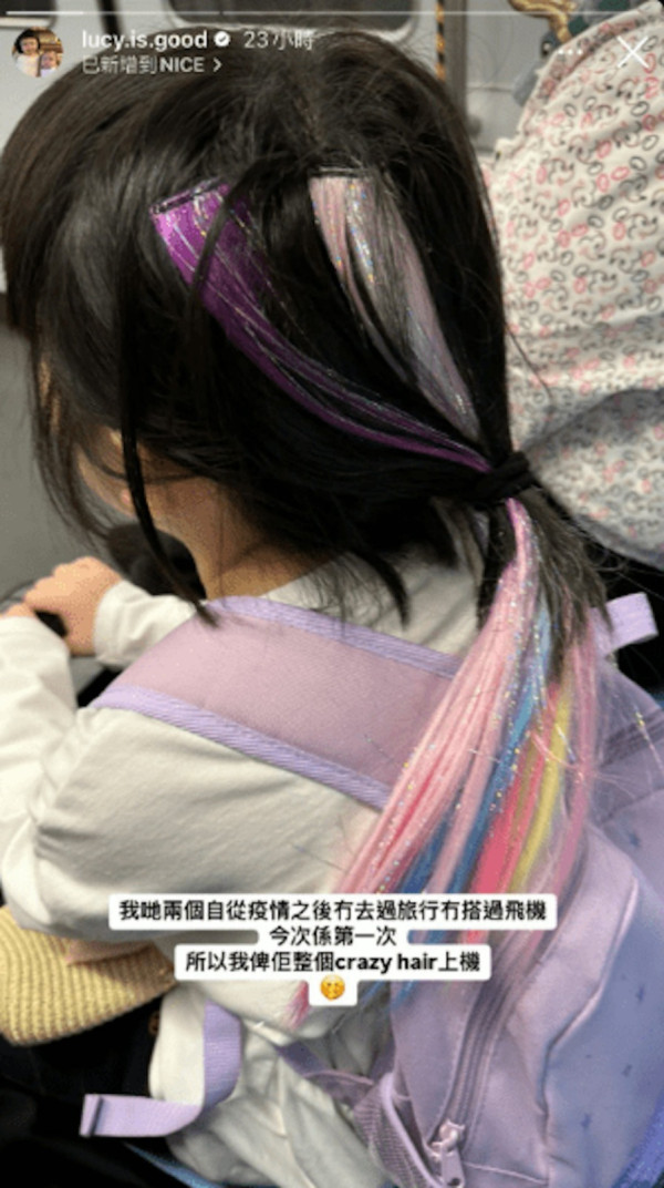 從囡囡的IG可見,Lucy大個女自己拉著行李箱登機,仔細看發現Lucy的頭髮夾了兩條七彩顏色的新髮型,超鬼馬!隨後媽媽亦在IG的限時動態寫上:「我哋兩個自從疫情之後冇去過旅行冇搭過飛機,今次係第一次,所以我俾佢整個crazy hair上機。」