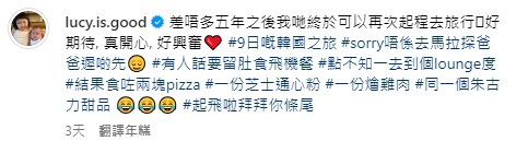 準備升小學一年級的Lucy就捉緊暑假尾巴,與媽媽一起到韓國旅遊並在社交網晒出旅行的照片,配文「差唔多五年之後我哋終於可以再次起程去旅行~好期待,真開心, 好興奮❤️#有人話要留肚食飛機餐 #點不知去到個lounge度 #結果食咗兩塊pizza」。