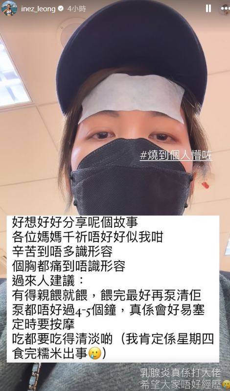 早在5月Inez便曾因產後持續發高燒以及胸部紅腫的問題入院,當時她發現自己患上乳腺炎,更表示情況太嚴重有機會需要用針抽膿或者開乳頭放膿,更寄語其他媽媽「千祈唔好好似我咁,辛苦到唔多識形容,個胸都痛到唔識形容...泵都唔好過4-5個鐘,真係會好易塞定時要按摩,吃都要吃得清淡嘟啲(我肯定係星期四食完糯米出事)。」