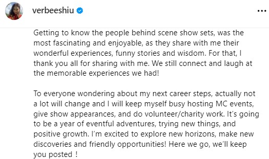 效力TVB至今10年時間,邵珮詩今日(7月22日)在IG社交平台上宣布離巢的消息,以英文撰寫長文,講到入行前在大學攻讀心理學時,萌生參加香港小姐比賽的念頭,之後幸運地當選冠軍入行,繼而進入了娛樂圈,嘗試各種不同角色的機會,不論是拍劇、主持、司儀、舞蹈演出,一直都付出了最大的努力。