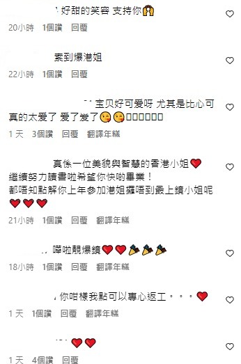 性感的身材吸引大批網民在文中大讚「索到爆港姐」、「靚爆鏡❤️」、「😍妳身材好好」、「美到爆😍」、「很深」、「真係一位美貌與智慧的香港小姐❤️」,更有網民笑言「你咁樣我點可以專心返工。。。❤️」。