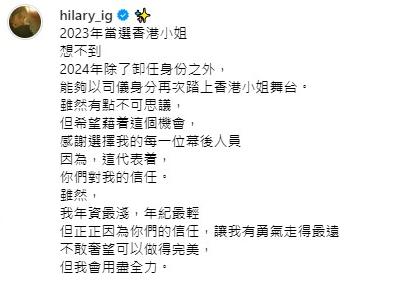 Hilary直言擔任《2024香港小姐競選》決賽司儀十分緊張又大壓力,她更在決賽前一晚在社交平台發文指「2023年當選香港小姐,想不到2024年除了卸任身份之外,能夠以司儀身分再次踏上香港小姐舞台。雖然有點不可思議,但希望藉着這個機會,感謝選擇我的每一位幕後人員,因為,這代表着你們對我的信任。雖然,我年資最淺,年紀最輕,但正正因為你們的信任,讓我有勇氣走得最遠,不敢奢望可以做得完美,但我會用盡全力。」