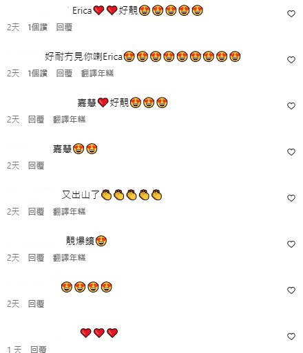 不少網民看見這輯性感照片後,都紛紛留言表示「Erica❤️❤️好靚😍」、「又出山了👏」、「靚爆鏡😍」、「瘦晒,正過之前😍」、「 美麗動人!😍」、「太美太辣了! 背影也拍的太辣爆了😍😍」。