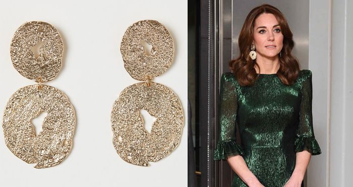 凱特王妃日常也會穿快速時裝品牌的服飾。這對H&M碾壓花紋的金屬耳環很有質感,和凱特身上的連身裙十分相襯。