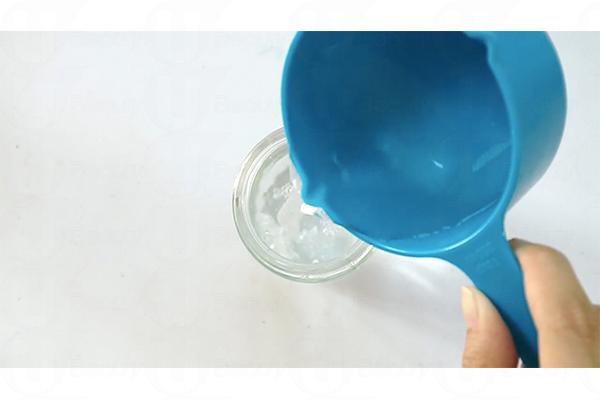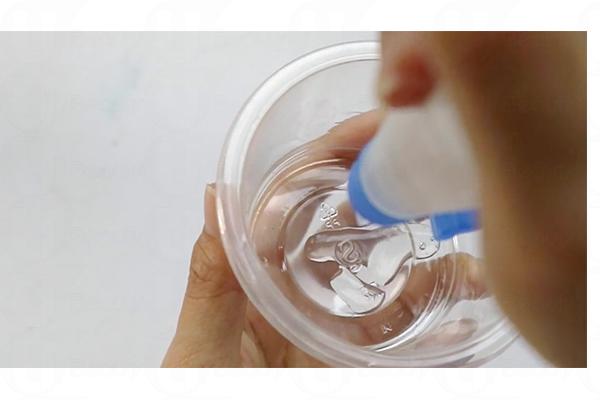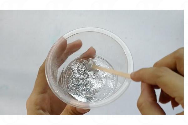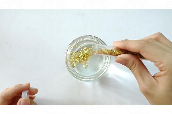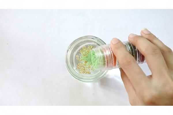 2. 往玻璃樽注入水、甘油、珠片和閃粉