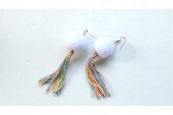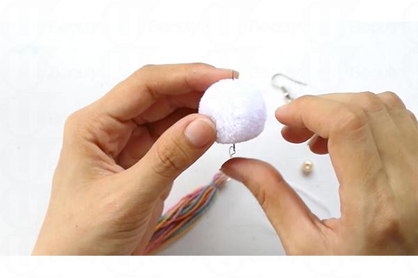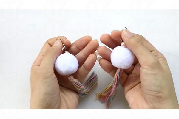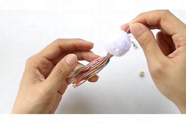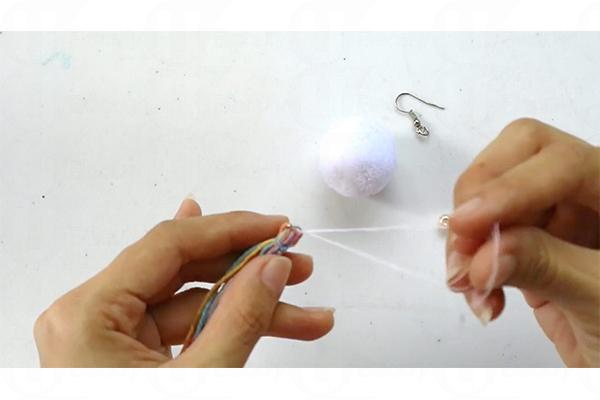 7. 把絨球、珍珠、七彩繩和耳環扣縫合起來