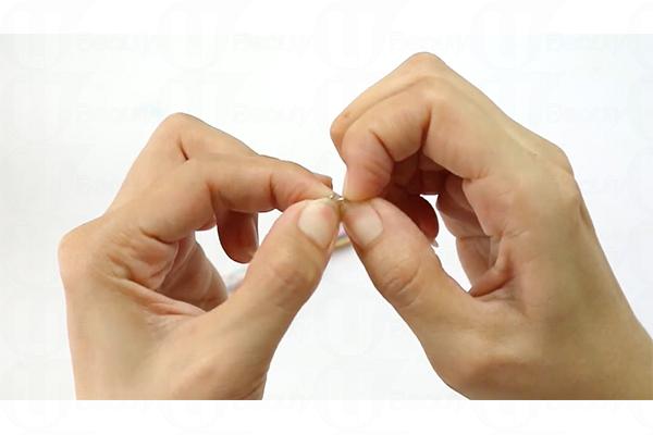 3. 打開圓扣的摺口,放入七彩繩,關上摺口