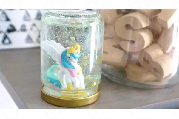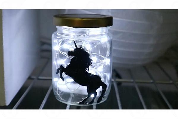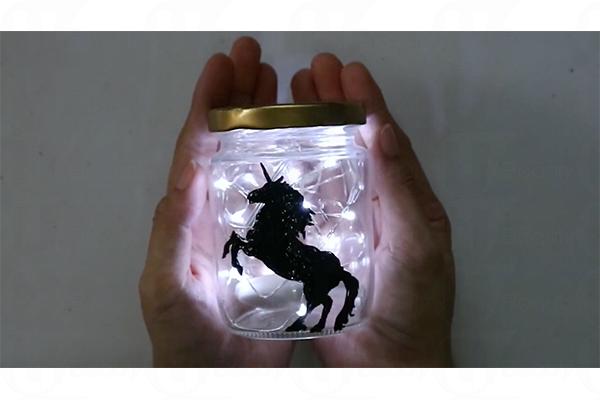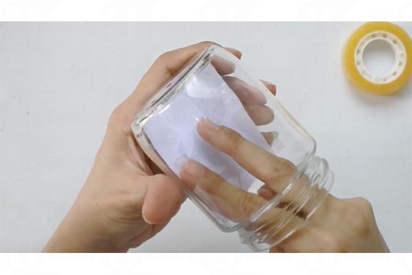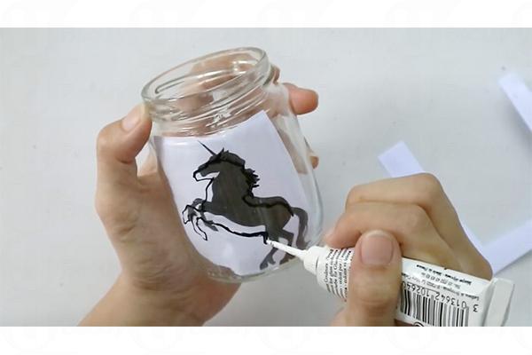 2. 用膠紙把獨角獸圖案貼在玻璃樽內