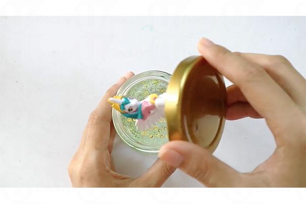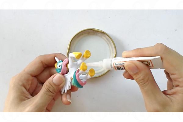 1. 在獨角獸模型的四隻腳分別塗上萬能膠,黏在玻璃樽蓋上
