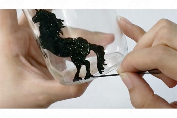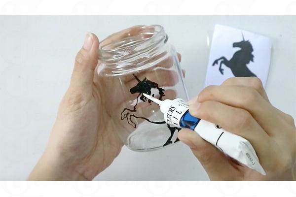 3. 沿著紙上外型,用玻璃漆在玻璃樽上畫獨角獸