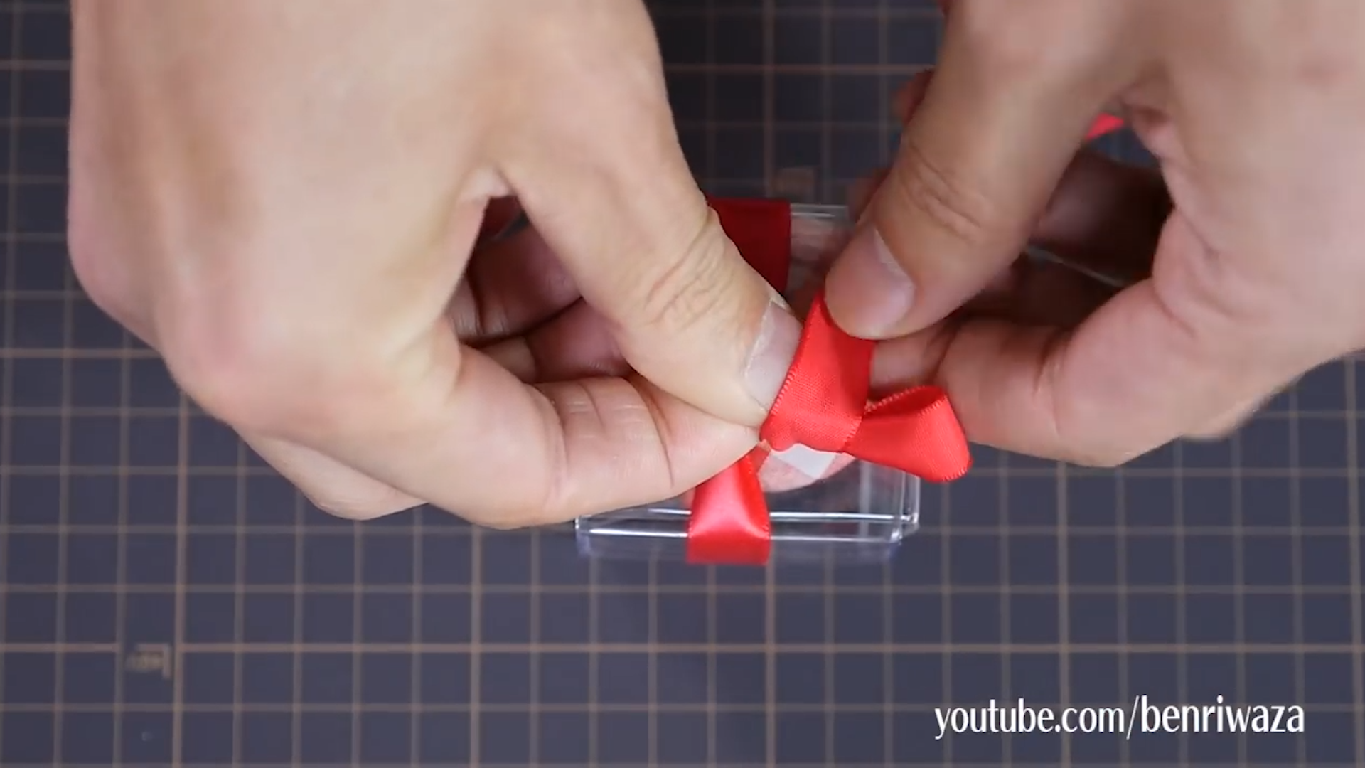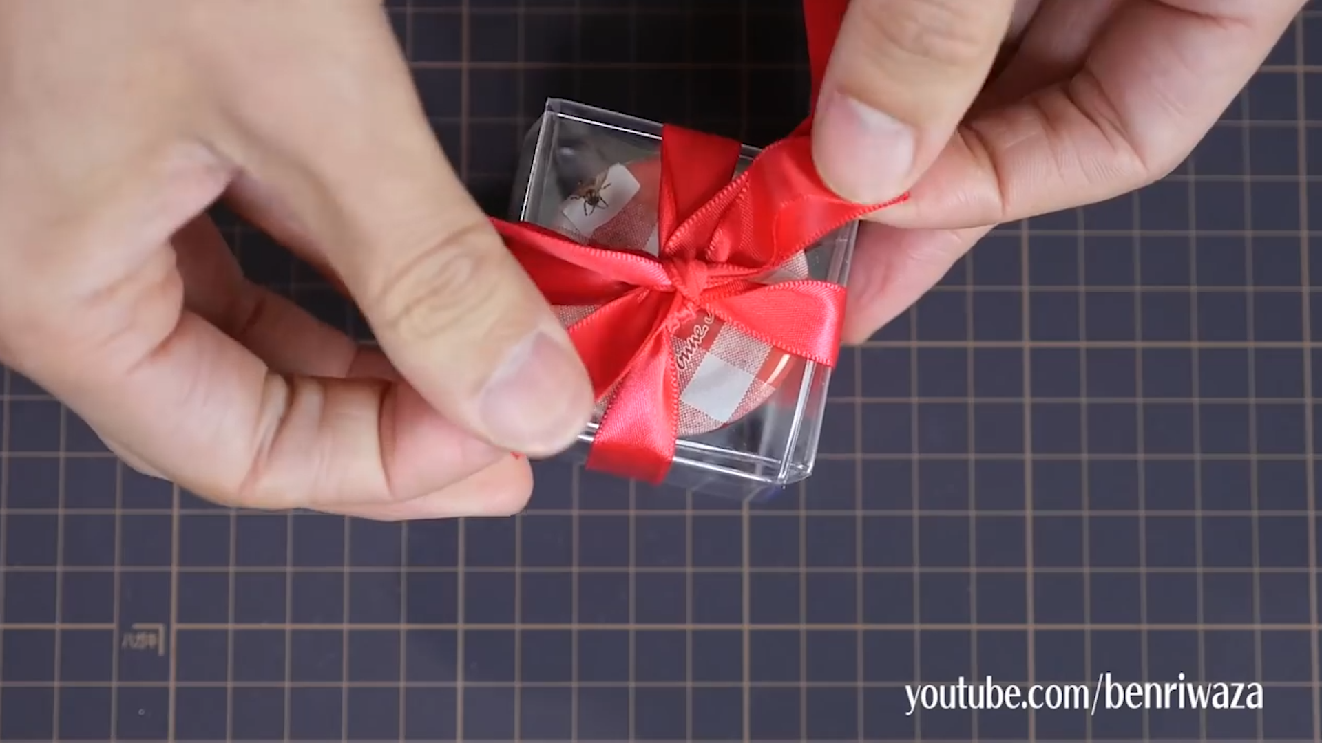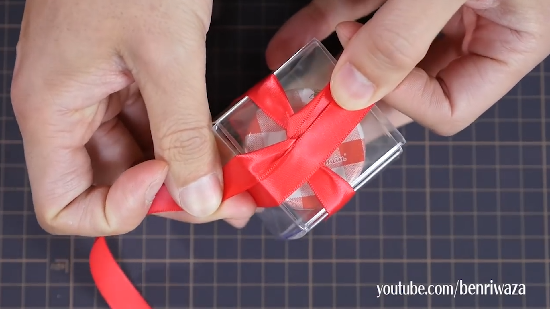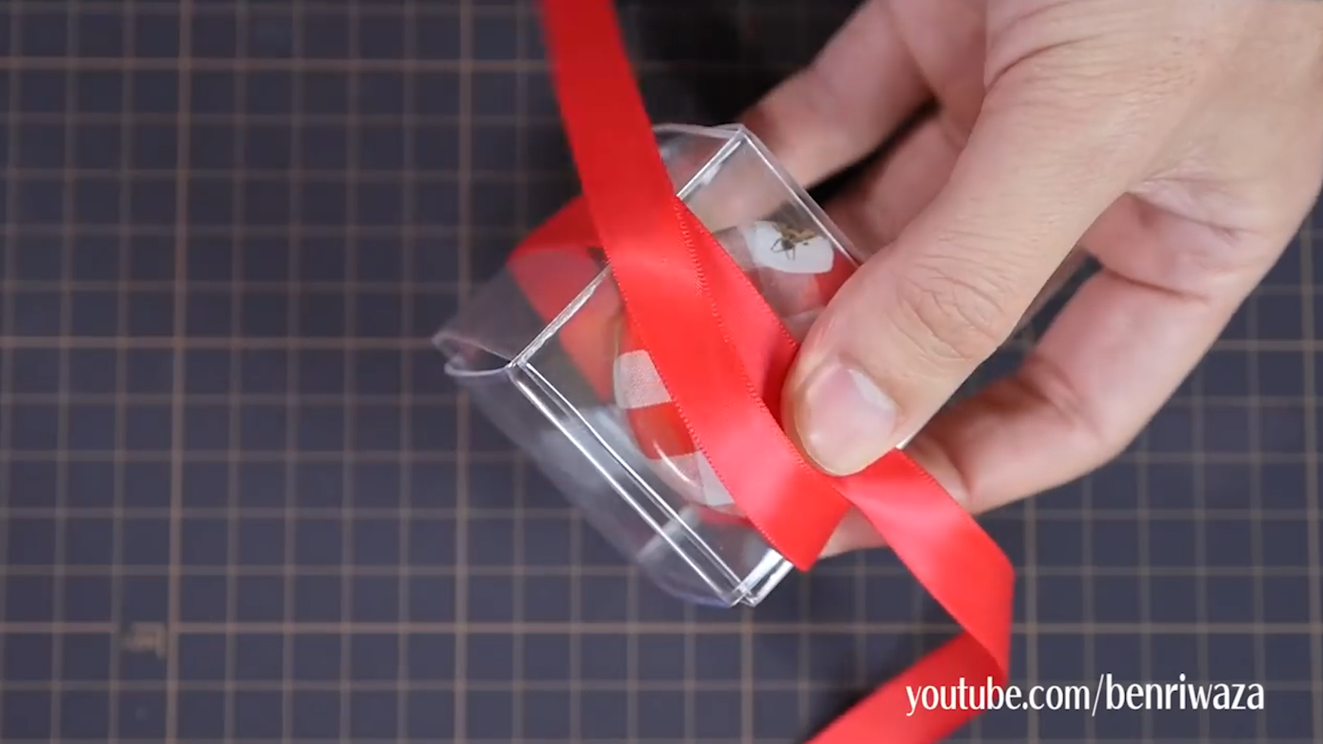 將兩個膠套套在一起,用絲帶圍住盒子,打十字。