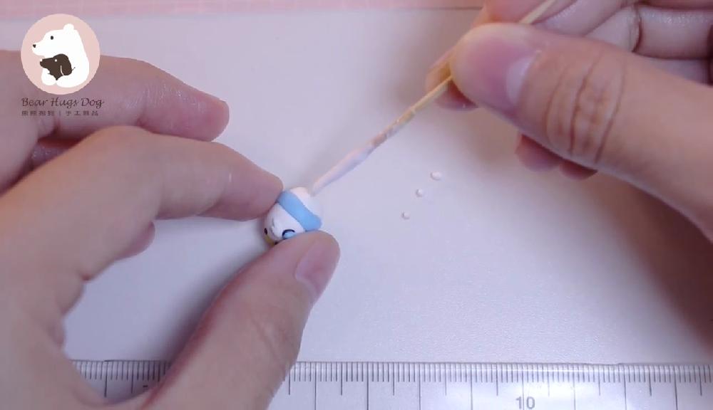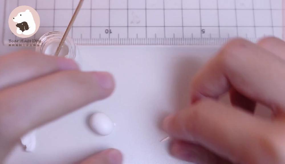 塗上白膠漿,取粉色黏土,搓圓,貼在面頰位置。用膠棒稍微壓扁,調整形狀。