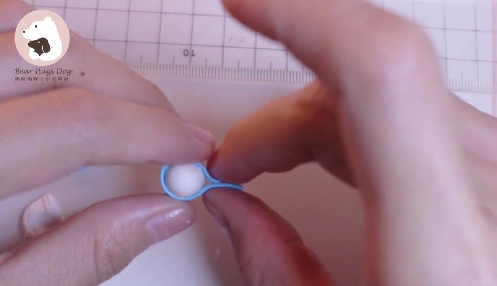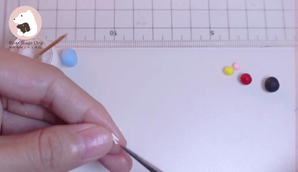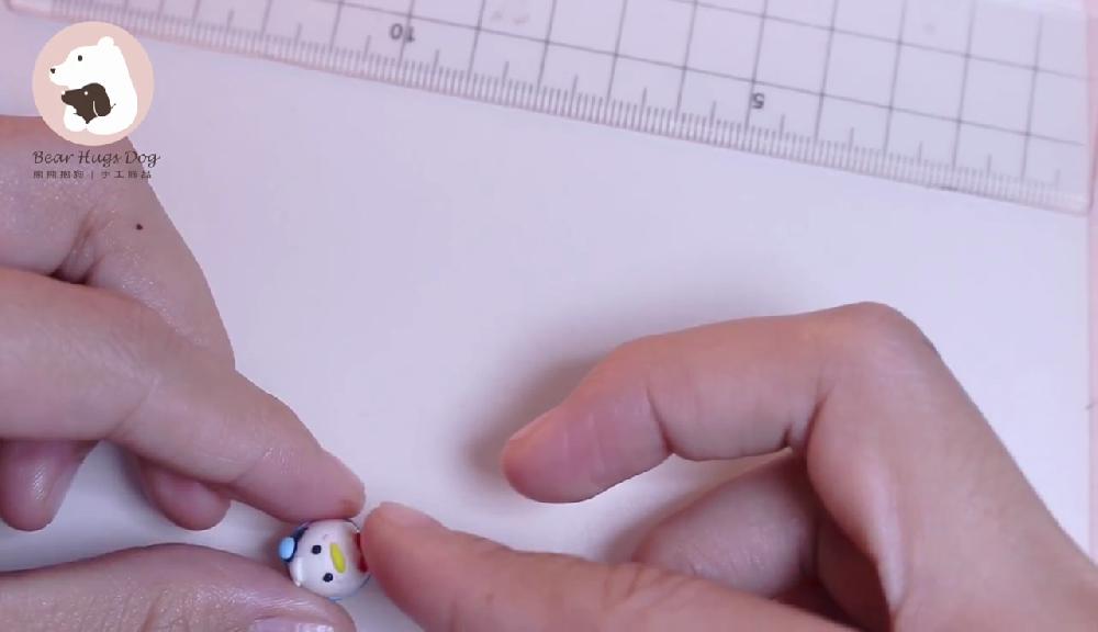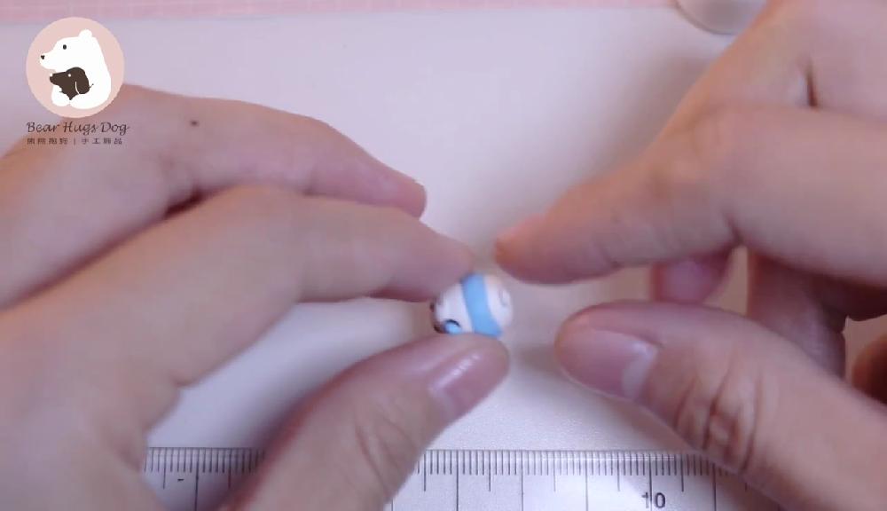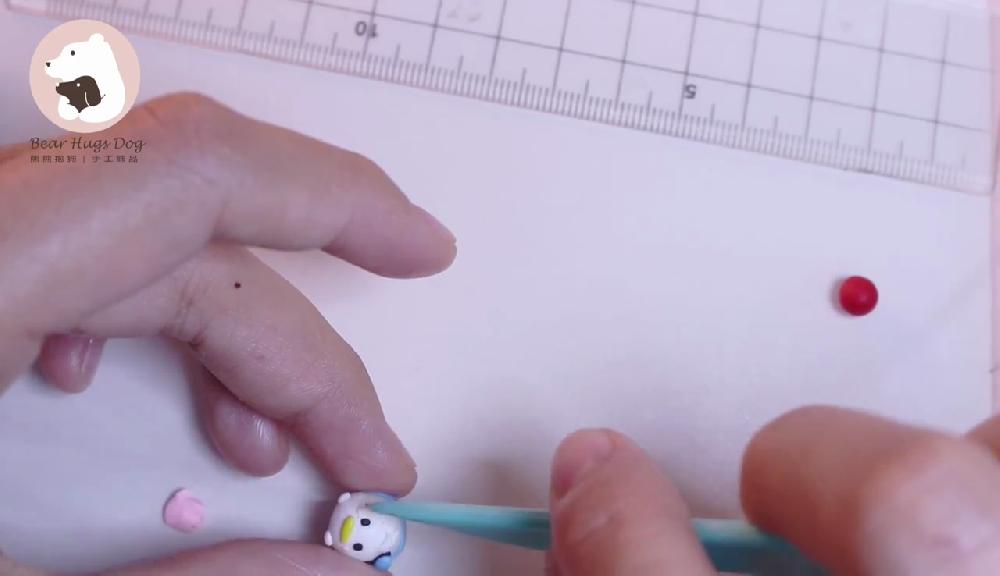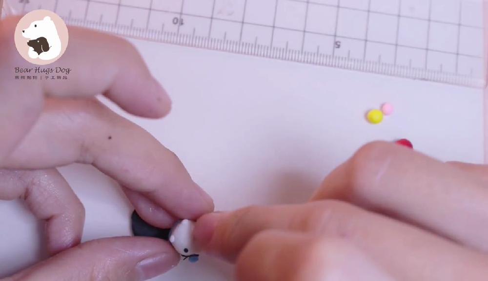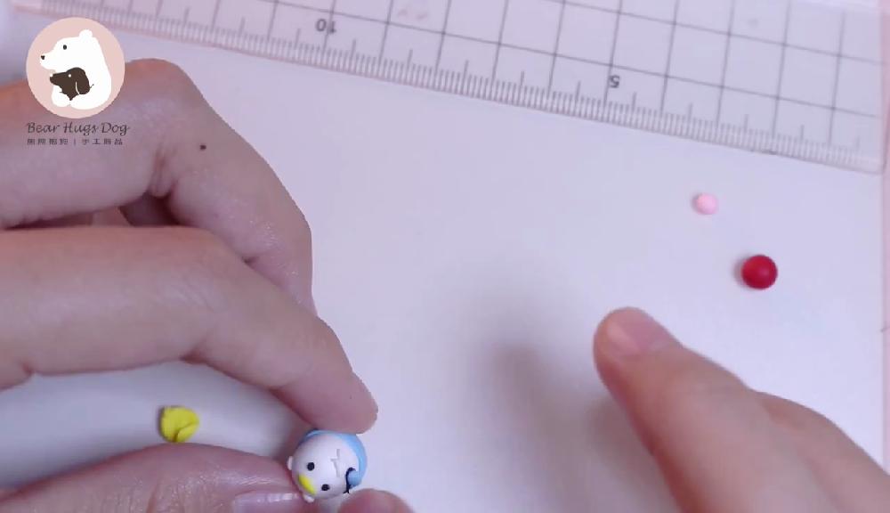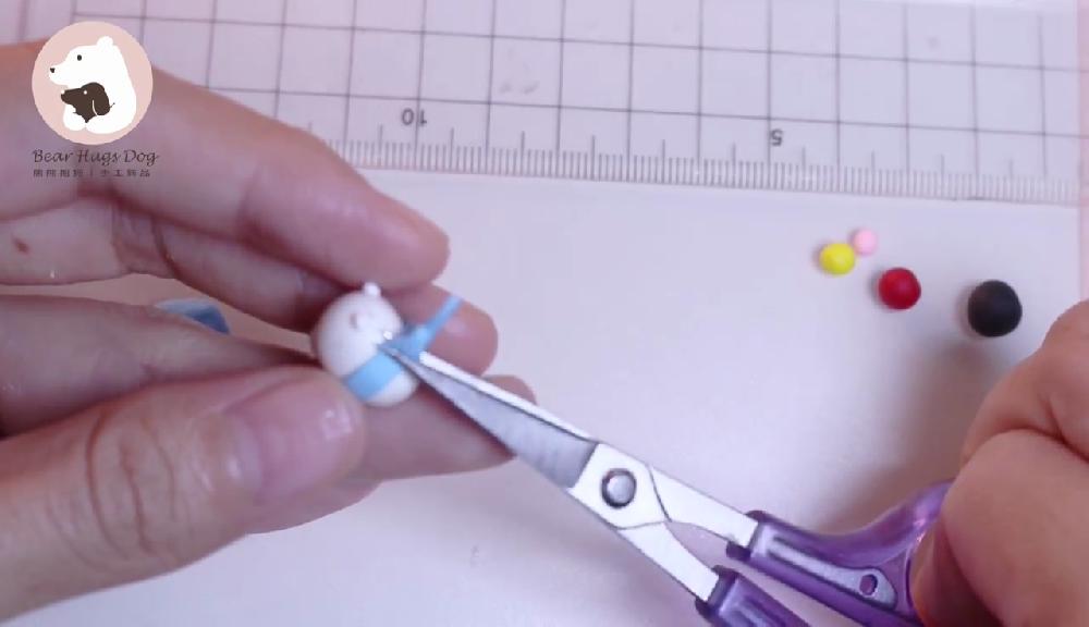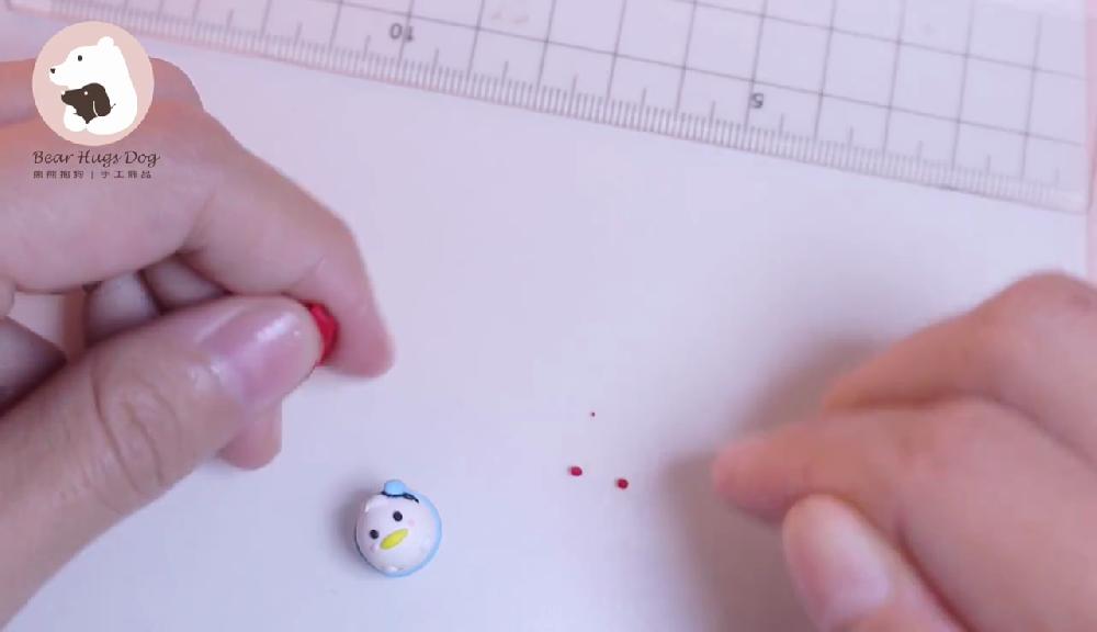 把紅色黏土搓圓,製作蝴蝶結,貼在嘴巴下方。