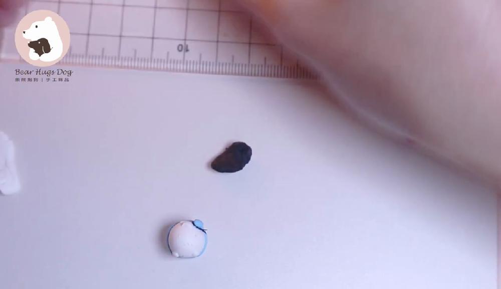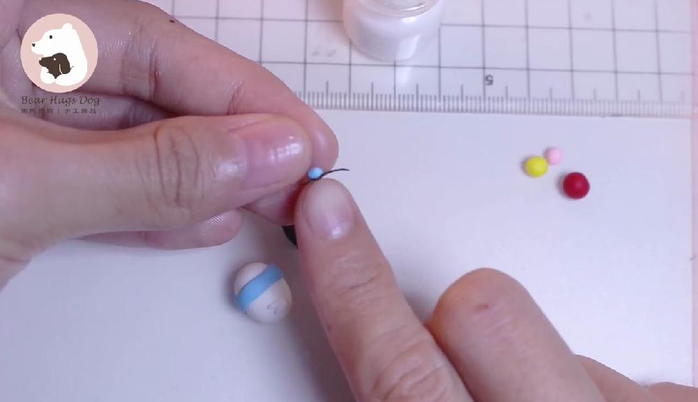 剪走多餘的黏土。取少量藍色黏土,搓圓。把黑色黏土搓成條狀,圍繞藍色黏土,製作帽子!