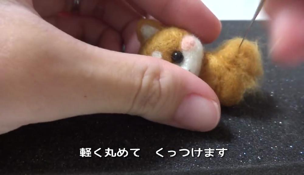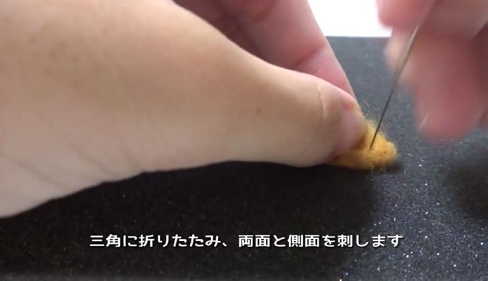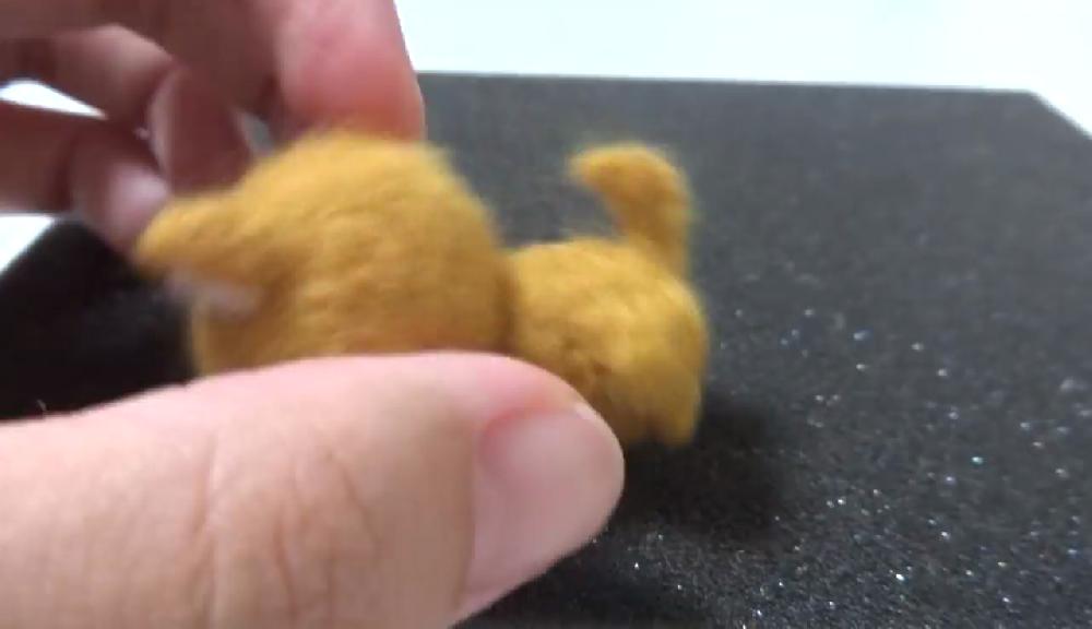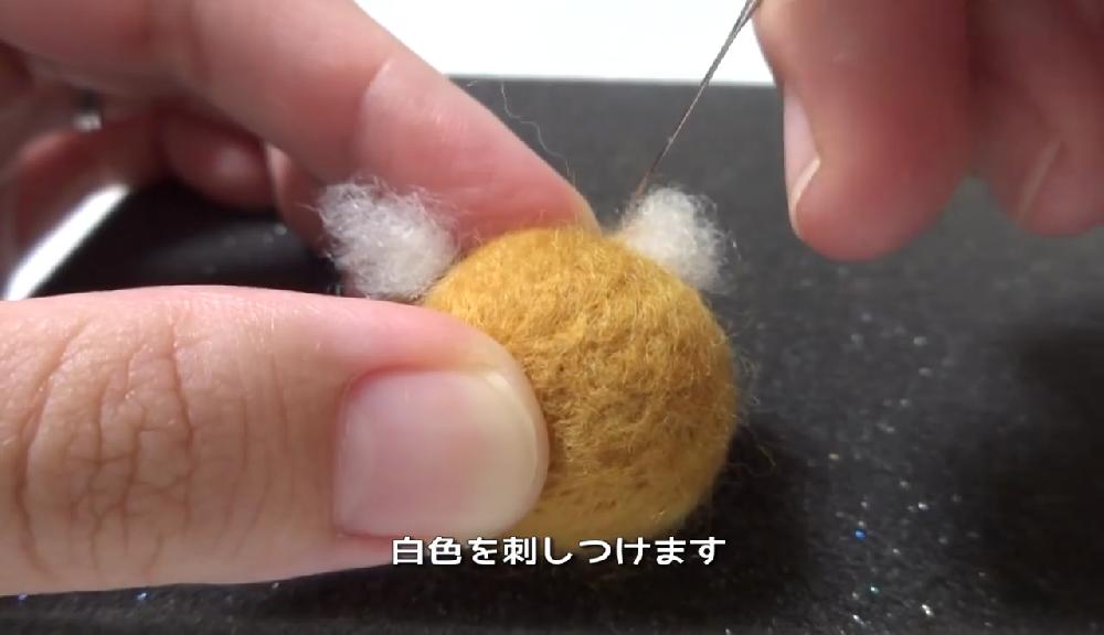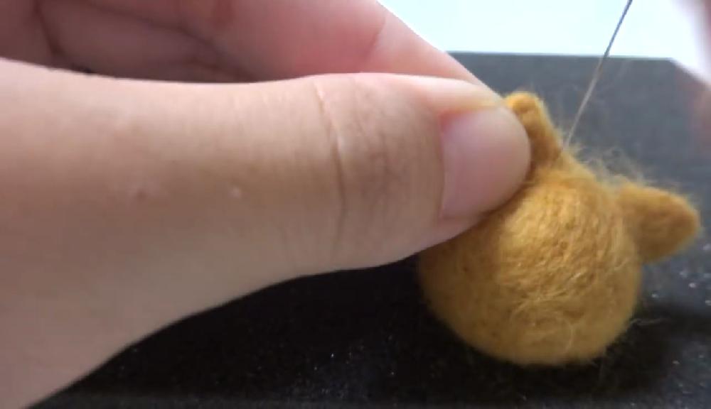 將羊毛戳成三角形,製作耳朵。連接頭部和耳朵。