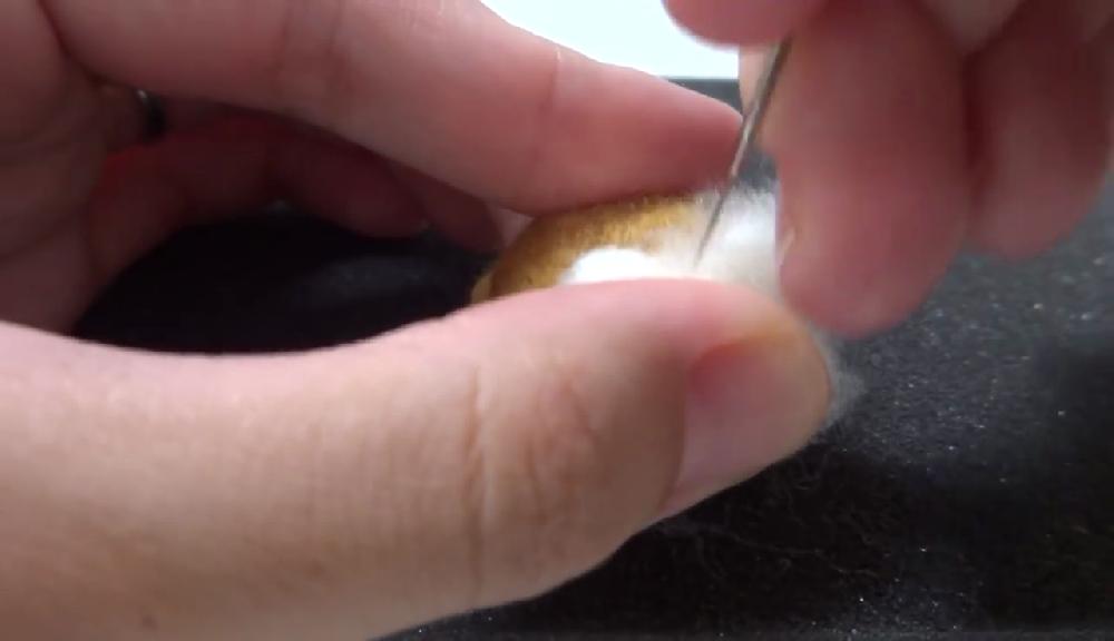 用白色羊毛,製作臉部隆起位置。加入羊毛,戳刺臉頰。