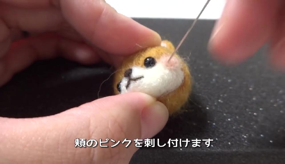 把粉色羊毛戳刺在臉頰位置,然後戳刺眉毛。