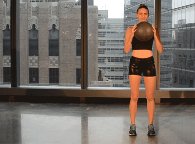 雙腿站立的距離約肩膀的兩倍,腳尖向外,跟深蹲的姿勢一樣,身體向下,雙手拿著啞鈴朝下(或以注滿水的水瓶代替),雙腿屈曲90度,重覆20次為一組,共做3組。