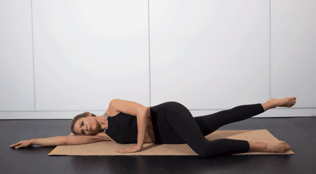 跟上一組動作相似,打側躺下後,右手平放,左腿向前屈曲,右腿向上抬起,然後打圈,感覺就像用腳趾尖畫圓圈,重覆10次為一組,共做2組。記得兩邊都要做喔~