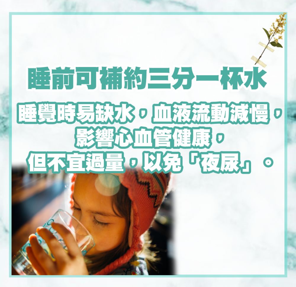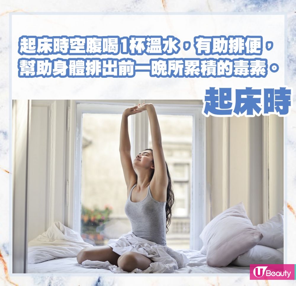 不過在營養學角度中,喝水沒有「黃金時間」,何時喝水都可以排毒。不過若怕水腫,應避免在睡前喝太多水或吃太鹹的食物,因為吃太鹹的食物會令你更想喝水。
