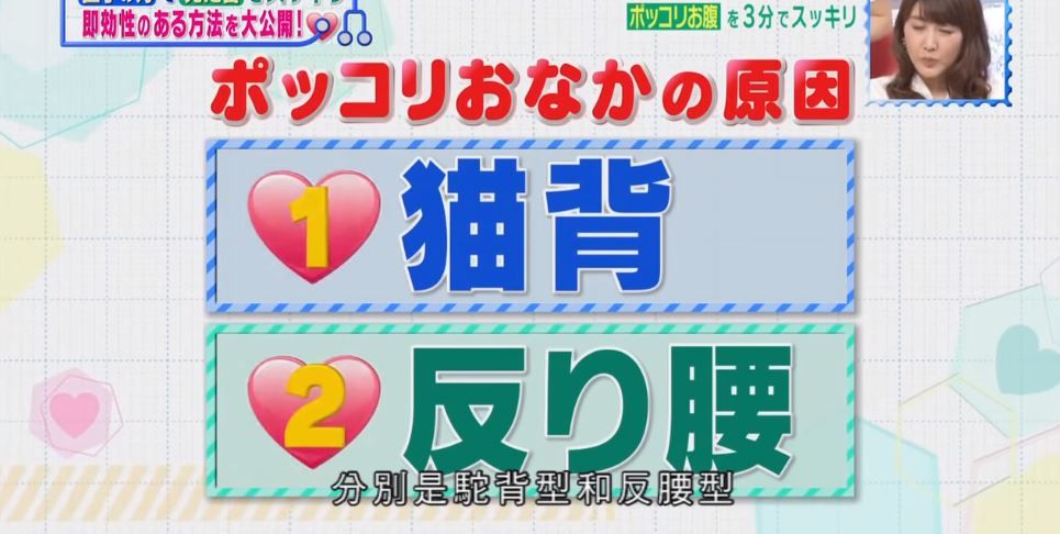 錯誤姿勢導致肚腩的成因分為2大類,分別是駝背型和反腰型。駝背型是指背部向前彎曲的狀態,內臟在肋骨和盆骨的壓迫下,被推向前,結果形成小肚腩。而反腰型是指背部向後彎曲的狀態,內臟自然被推向前,結果也形成小肚腩。只要將內臟移到正確位置,就自然能夠化解肚腩危機。