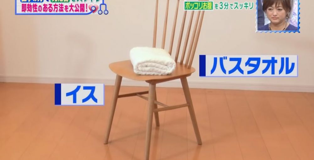挺直坐在椅子上,將捲起的毛巾夾在大腿中間,邊深呼吸邊挺胸收腹,收腹足夠後,便使力縮緊肛門,同時大腿用力夾緊毛巾,維持動作5秒。整套動作,一天3次。
