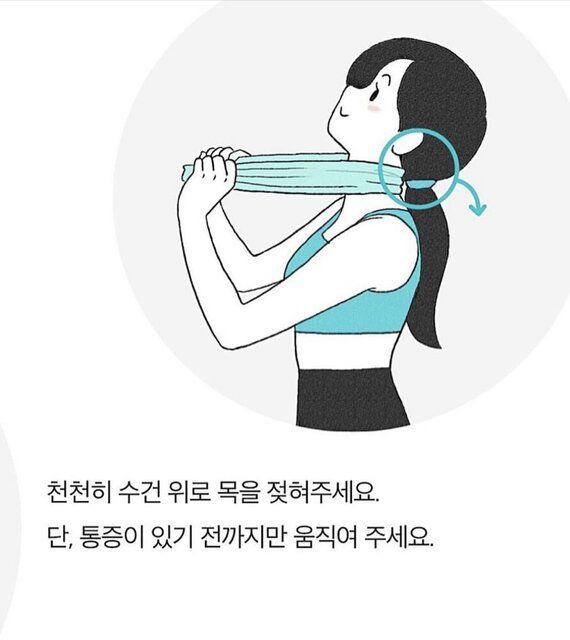 然後,把毛巾固定於頸部後方,雙手盡量握住毛巾兩端,把頸部的重量承托在毛巾之上,慢慢放鬆頸部,將頭部以及脖子向後靠,眼睛的視線望向上方。這時候我們能夠感受到,頸部因為伸展而有拉扯的感覺,當頸部開始感覺到酸痛的時候,就可以換下一套動作了。千萬不要過於「心急」,否則可能會拉扯到頸部的肌肉喔!