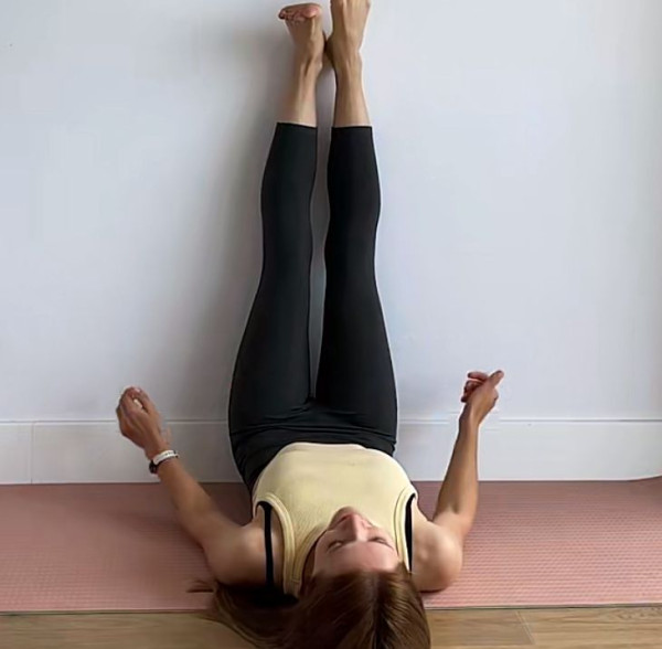 首先可以把雙腳靠牆抬起,同時墊高骨盆,停留1-2分鐘,這個動作可以幫助下半身的循環,消除腿部浮腫,是瘦腿的絕佳秘密武器!