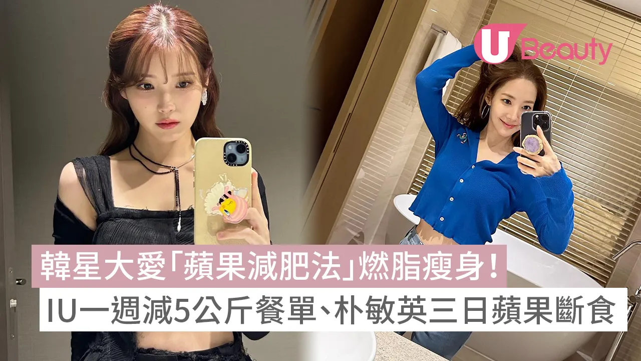 不少韓星如IU和朴敏英都曾透露過自己的瘦身秘訣,而「蘋果減肥法」更是她們心水瘦身餐單!好像IU以控制熱量的方式進行「蘋果減肥法」,一天只攝取300卡路里的熱量,並搭配粗糧飲食(例如玉米、小米、燕麥、蕎麥等多種谷類)及運動,成功瘦身。她的菜單包括早餐的蘋果、午餐的地瓜以及晚餐的高蛋白奶昔。IU表示,這樣的減肥法使她成功擺脫出道初期的嬰兒肥,一週就減去了5公斤的體重。