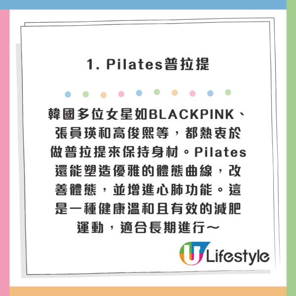 普拉提(Pilates)是一種低強度的全身運動,專注於增強核心肌肉群的力量,並改善整體的姿態和平衡。Pilates訓練通常包括一系列有節奏的伸展和肌肉強化動作,可以有效提升肌肉的耐力和柔韌性,並同時燃燒脂肪。韓國多位女星如BLACKPINK、張員瑛和高俊熙等,都熱衷於做普拉提來保持苗條身材。除了瘦身,Pilates還能塑造優雅的體態曲線,改善體態,並增進心肺功能。這是一種健康、溫和且有效的減肥運動,適合長期進行~