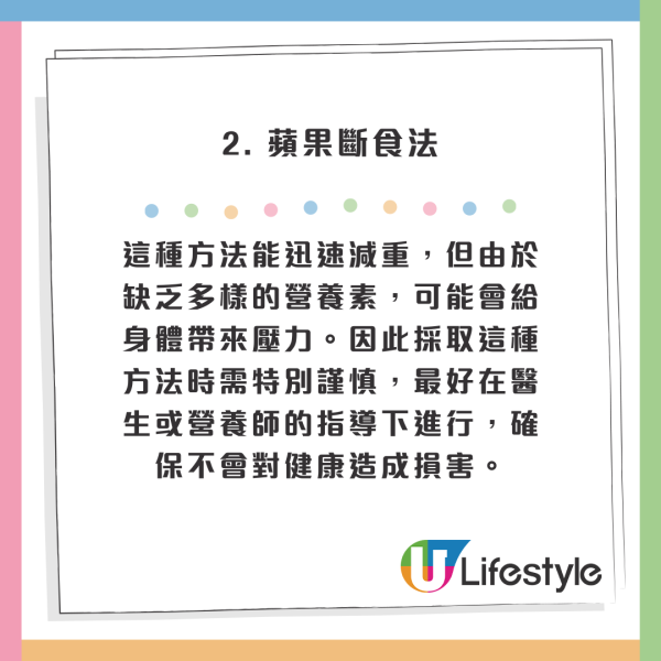 蘋果斷食法是一種快速減重的方法,通常進行1至3天。主要以蘋果為主食,通過嚴格限制食物攝取來達到熱量大幅減少的目的。這種方法能迅速減重,但由於缺乏多樣的營養素,可能會給身體帶來壓力。因此採取這種方法時需特別謹慎,最好在醫生或營養師的指導下進行,確保不會對健康造成損害。