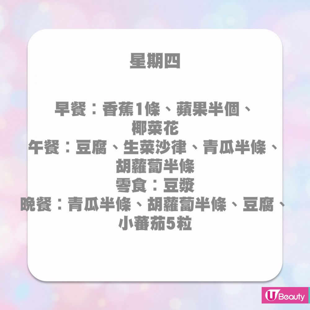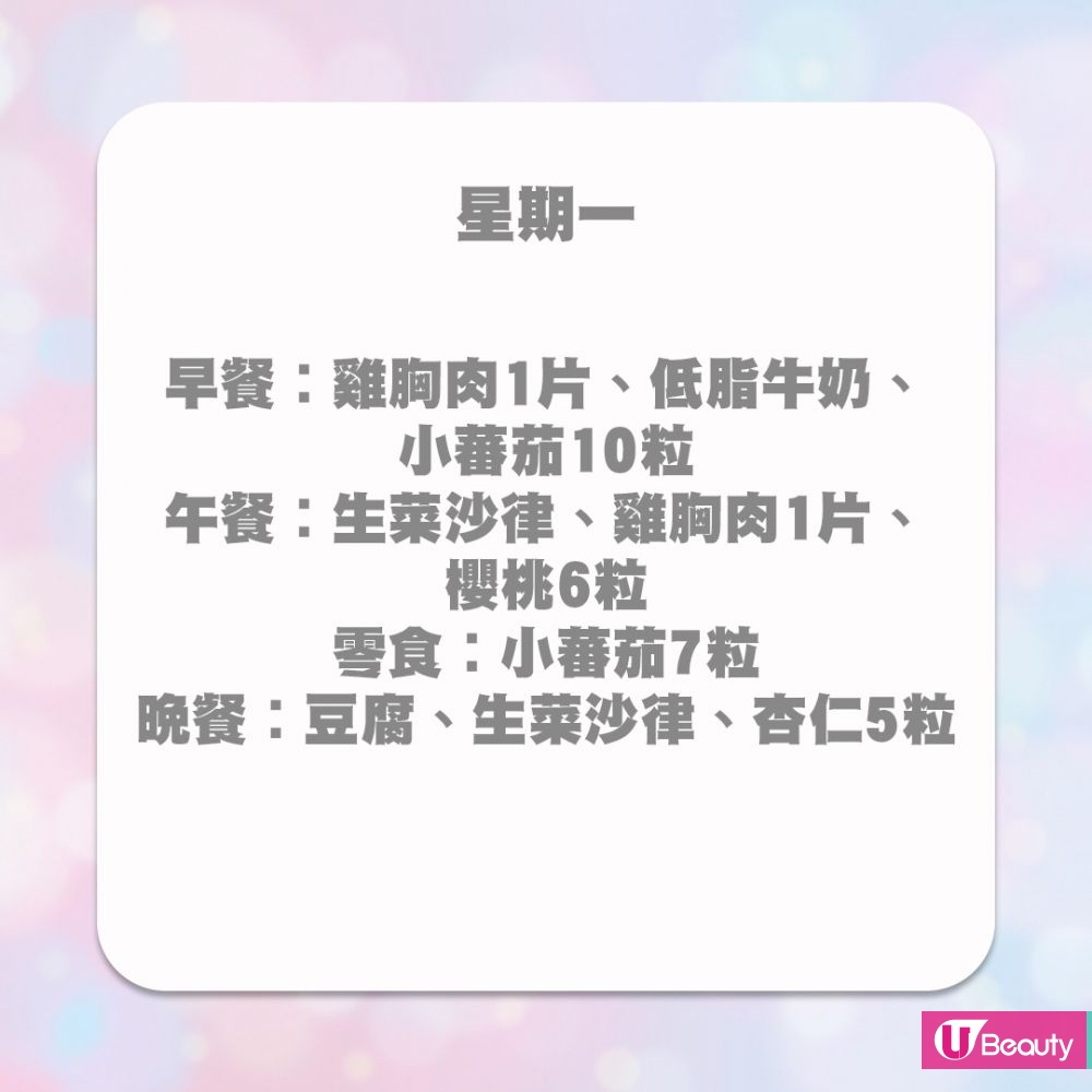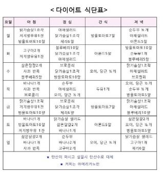 曾經有韓國練習生在Instagram上分享7天的減肥餐單,公司指跟據這個餐單,一個月可以瘦下約5kg。當然,練習生們平日也安排了跳舞課程,有充足的運動量。雖然該帖文已被刪除,不過仍然在網絡上瘋傳,也有不少女生作為減肥時的參考。不過,餐單中完全沒有碳水化合物,也有人擔心會有體力不支的情況出現,建議要按個人的狀況再作調整。