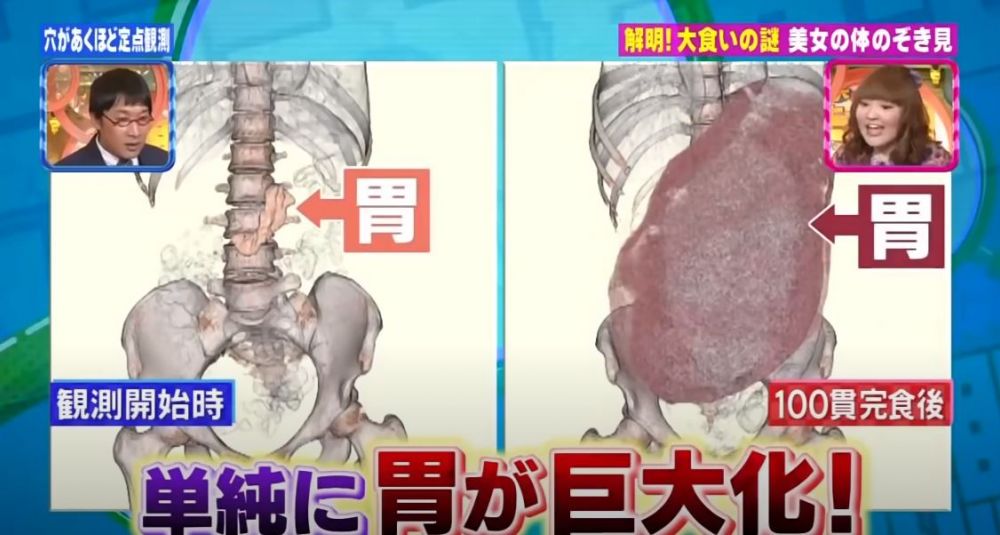 看到木下肚子的變化,真的覺得她食量十分驚人!在吃完5個咖喱飯之後,她的肚子就如同是懷孕3個月一樣大!但其實這對木下來說一點都不是什麽奇怪的事情,曾經也有日本節目希望拆解木下的身體結構,結果發現她在吃完100件壽司之後胃部比原本的大了整整66倍,但卻對其他器官沒有太大的影響,讓醫生也十分困惑!
