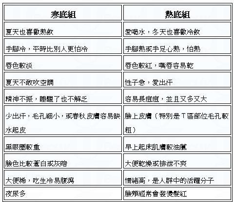 輕微熱底:如果熱底組得分多於寒底組,且總選項少於7,屬於症狀較輕的熱底肌膚。