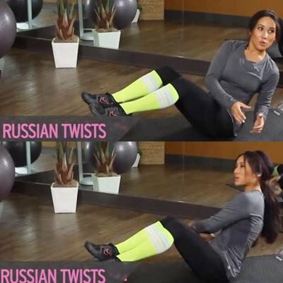 10) 雙腳離地,重心放在屁股,左右輪流扭身合共30次。
