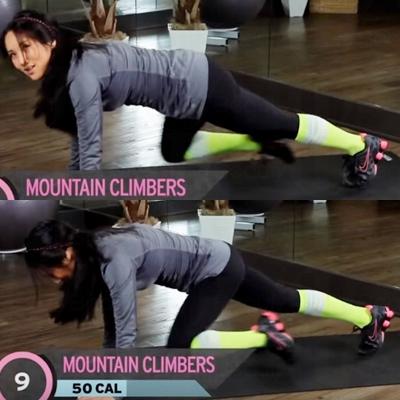 8) 重覆步驟2:兩手向上伸直,輕跳一下,再做一個伏地挺身。共做5組。
