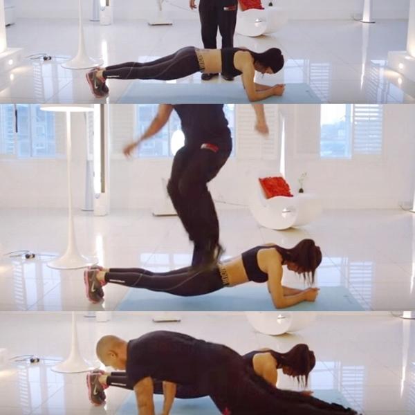 女生上身用手肘承托身體,以腳尖觸地;男友輕跳過女生,再在女生旁邊做一下撐蹲立。這個動作有助燃燒腹部脂肪,女生更可減走bye bye肉!